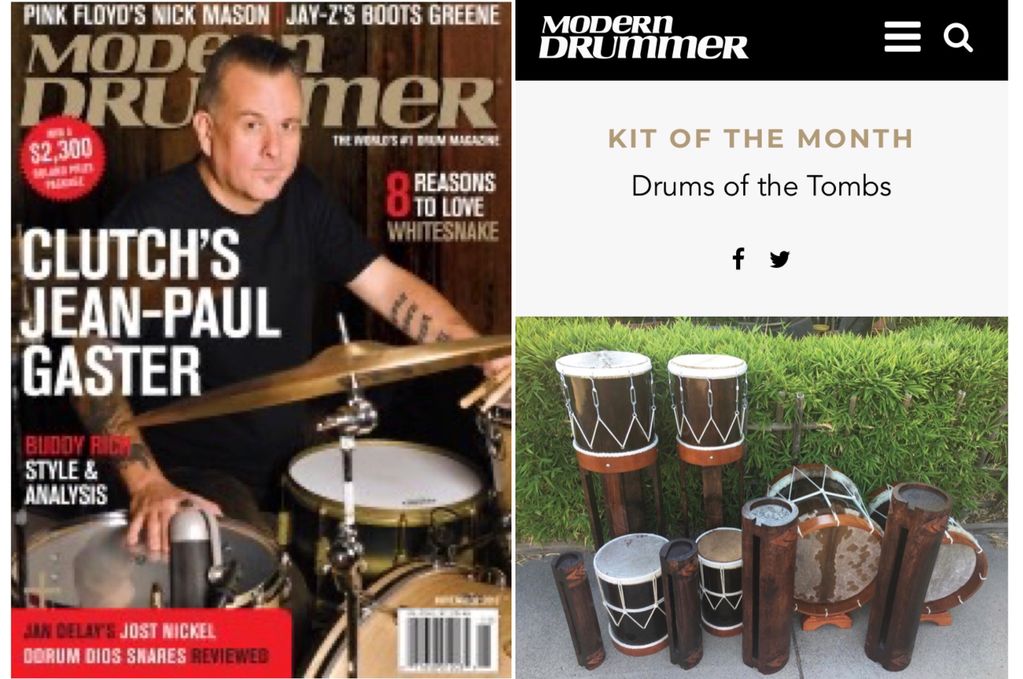 Feature in "Modern Drummer" magazine kit of the month November 2018 https://www.moderndrummer.com/article/november-2018-drums-of-the-tombs/