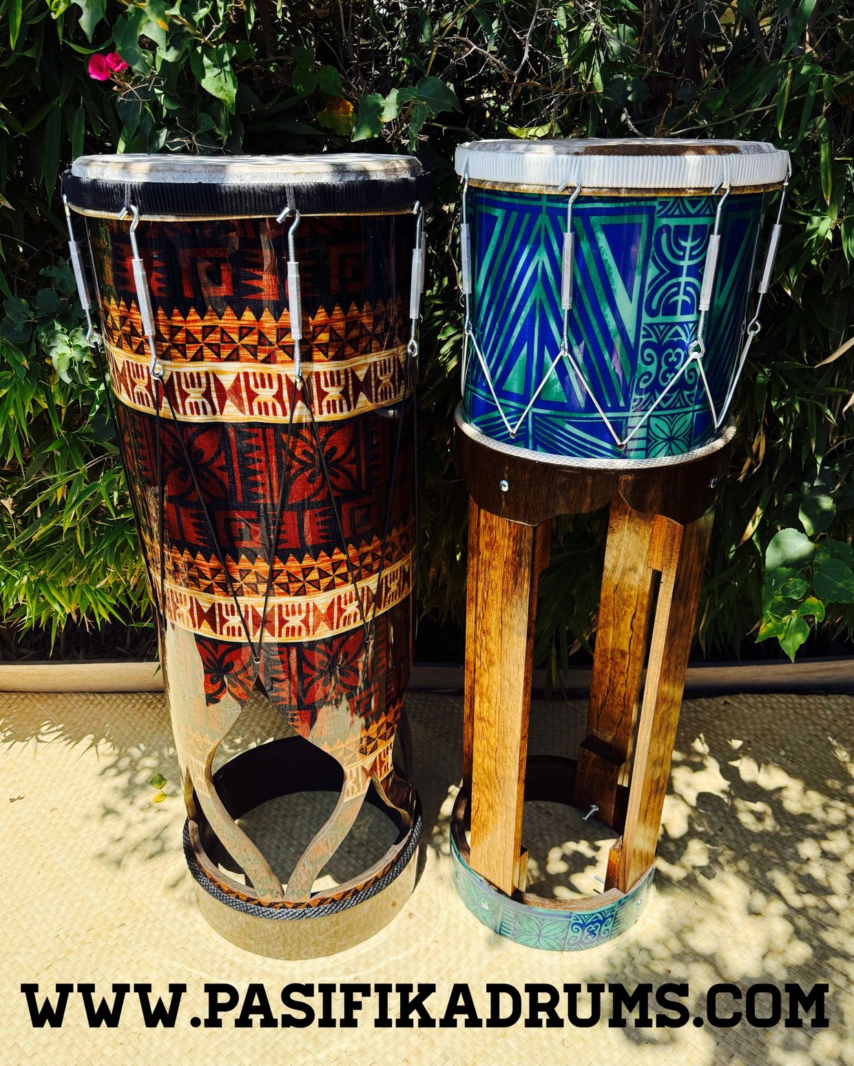 The Pahu Tupa'i or Pahu Rima is a hand drum that adds padding and rhythm underneath the rest of the drummers. Like our bass drums and Faatetes, they are made from 100% hand bent wood. We offer 2 main variations: solid body ones and ones with detachable legs (easy to transport). Both options can come in a 12", 14", or 16" *NEW SIZE* diameter by 4 feet tall. They come topped with your choice of goat skin (recommended), vinyl, or cow skin.